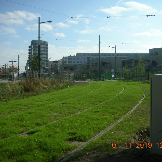 Die Rasengleise für die verlängerte Linie D sind nun ein unübersehbares „grünes Band“ entlang des Helmut-Zilk-Parks. Die Favoritner Grünen haben sich gemeinsam mit Bewohner:innen des Sonnwendviertels eingesetzt, dass dieses „grüne Band“ errichtet wird.